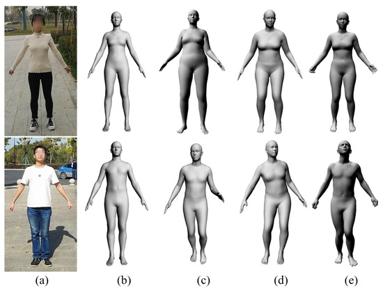 To estimate an accurate 3D body shape, some under-clothing shape estimation methods have been proposed. “The naked truth” [26] is one of the earliest works on recovering the underlying shape; it fits the SCAPE model to a set of calibrated multi-view images or video sequences. The drawback of this method is that it requires the subjects to be captured in several different poses or in a long dynamic sequence. Wuhrer et al. [27] presented a representation that models human body shape and posture independently. et al. [28] proposed a learning-based framework, Body PointNet, to estimate body shape and pose under clothing from a 3D scan. The estimated body shape is output in a point cloud by operating on a single scan of a dressed person. However, both of these two methods estimate the shape under clothing directly from 3D scans instead of images, making them not as convenient as image-based methods. Streuber et al. [29] introduced Body Talk, which creates a plausible 3D body from standard linguistic descriptions of a 3D shape. This approach mostly uses semantic values that are difficult to quantify; therefore, it may not achieve metric precision. Shigeki et al. [30] proposed an approach to estimate 3D under-clothing human body shapes from a single RGB image. Their approach optimizes an SMPL [21] model using a cloth–skin displacement model, silhouette shape and joint locations. Zhu et al. [5] proposed a method to predict realistic and precise under-the-clothes human body models based on two orthogonal-view photos. However, it requires tedious manual feature extraction operation to be performed on the images.