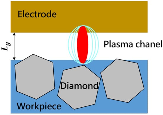 The principle of EDM processing PCD is shown in Figure 1. As the controller controls the feed rate, the gap (Lg) between the electrode and the workpiece changes accordingly. The electrode (positive electrode) and the surface of the workpiece (negative electrode) are rich in a large number of cations and anions, which are, respectively, affected by the electric field. As the intensity of the electric field increases, electrons are conducted to the surface of the workpiece to form a loop. Wang et al. [4] proposed that when EDM processed PCD, there was a graphene film on top of the PCD, and the discharge point was not restricted by the metal binder or limited to conductive materials (which was the case of conventional EDM). The discharge point could work on any surfaces of the piece theoretically. Therefore, this increased the occurrence of effective discharge pulses and contributes to an increase in material removal rate. According to Pei et al. [5], when a discharge spark occurred, the electric field strength between the electrodes reaches the strength of the dielectric breakdown. Avalanche ionization and collision dielectric would then occur, and the PCD particles would melt and evaporate.