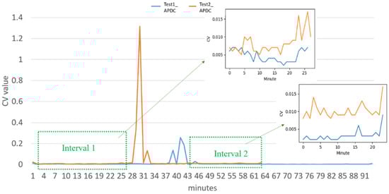 After calculating the seven features, the coefficient of variation of each feature per minute is calculated. Taking 26 min (1–25 min) before abnormal processing as the normal value and 23 min (40–63 min) after processing as interval 2, interval 1 and interval 2 are converted into probability, and the KLD value of the two intervals is calculated. It has occurred, and the time when it appears with probability is not obvious. In a period of time, the second period is significantly shorter. KLD increases by 0.209. The abnormal method can determine the normal and processing trends shown in Figure 4.
