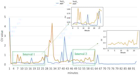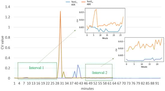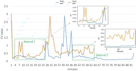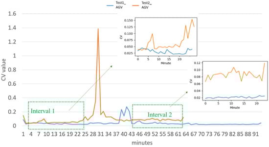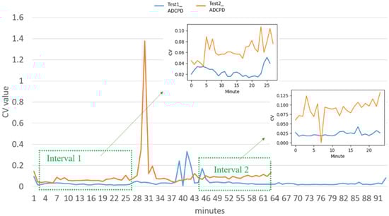 The coefficient of variation of a set of data is defined as the value obtained by dividing the standard deviation σ of this set of data by the mean μ, as shown in Equation (8). The coefficient of variation is the relative amount of difference, which is used to compare the dispersion of the two sets of data.