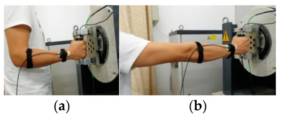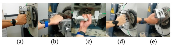 The trial is testified on six subjects, all six of whom are male. The anthropometric data and age of the subjects are shown in Table 1, and the mean in the table is the mean of the six subjects and SD is the standard deviation. Before the test, the subject learns the steps of the test and is instructed to hold the handle in the specified posture and keep the grip and thrust force within the specified values. The subject is trained several times before the test to ensure that reliable test data can be obtained during the test. The test is conducted with the subject standing upright on a horizontal floor using three different grip forces (g0 N, g30 N, g60 N) and three different thrust forces (p20 N, p50 N, p80 N), and the magnitude of the grip and thrust forces are displayed in real-time by a display during the test. The wrist posture and arm posture used in the measurement are shown in Figure 1 and Figure 2, and the elbow should not touch the body during the measurement. The sensor on the wrist is fixed in the adapter and then tied to the wrist area by elastic straps, which are tightened to the extent that the subject feels comfortable, and the sensor is always fixed to the backside of the wrist in different wrist postures, as in Figure 1.