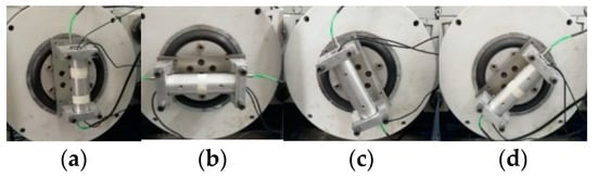 In summary, this research hopes to further improve the understanding of vibration damage mechanisms in the wrist region and to establish a more effective biodynamic model of the hand-arm system. In this study, the effects of arm posture, grip force, thrust force, and wrist posture on the total vibration transmissibility of the wrist region are comprehensively analyzed, among which the effect of wrist posture is proposed for the first time. The different wrist postures are obtained by holding the vibrating handle at the different mounting angles (as shown in Figure 3: (a) 90°, (b) 0°, (c) 30°, and (d) 45° indicate that the handle is mounted vertically, horizontally, vertically inclined to the left at 30° and vertically inclined to the right at 45° respectively). In this paper, the vibration response of the wrist part in three orthogonal directions is obtained by experiment, then the total vibration transmissibility of the wrist part is also obtained. The total vibration transmissibility of the wrist on W2, W3, W4, and W5 postures (as shown in Figure 1b–e), is compared with the total vibration transmissibility in W1 standard posture, and the total vibration transmissibility at the wrist site under the influence of grip force, thrust force, and arm posture are compared with the reported vibration response characteristics.
