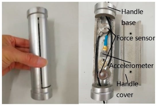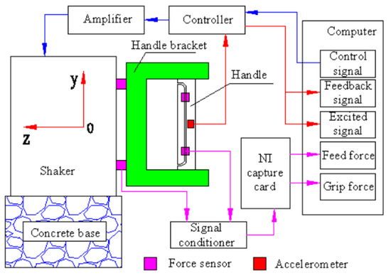 The test system for measuring the hand-transmitted vibration response of the hand-arm system is built according to ISO 10819:2013 [9] (as shown in Figure 4 and Figure 5). The test system consists of a single-axis electromagnetic shaker, a vibration controller, and an instrumental handle (as shown in Figure 6), of which the instrumented handle has a diameter of 40 mm and a length of 120 mm (the length of the grip part), the middle section of the handle is cut in half along the axis to form the handle base and the handle cover, and the inside of the handle is hollowed out to install a three-axis acceleration sensor (Dytran 3023A2, sensitivity: 10 mv/g) and two force sensors (ZNHBM161217) which measure the grip force. The handle bracket is connected to the transducer (Kistler 9317 C) for measuring thrust force and is fixed to the electromagnetic shaker by a clamp. The axis of the instrumental handle mounted on the handle bracket is perpendicular to the ground, and the vibration controller drives the electromagnetic shaker to vibrate along z-axis direction according to the given excitation signal. The z-axis is parallel to the ground and is perpendicular to the centerline of the handle (y-axis direction), as shown in Figure 4.