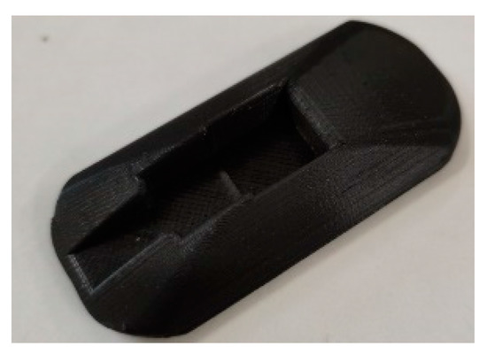 The three-axis acceleration sensor in the handle base is installed in the middle of the handle base and the three orthogonal measurement directions of the sensor are aligned with the coordinate system of the hand (as in Figure 7). The sensor is used to measure the z direction acceleration that is the vibration signal of the single-axis electromagnetic shaker. The excitation signals used in the experiment are consistent with those specified in ISO 10819:2013 [9]. Broadband random vibration in the frequency range of 5 to 1600 Hz is shown in Figure 8, with the x-axis being the frequency (f), the y-axis being the power spectral density (PSD), the reference signal being the excitation signal set by the controller, and the control signal is the actual feedback excitation signal. The sensor for measuring acceleration at the wrist is fixed using an adapter; one of the directions of the sensor must be parallel to the excitation direction z of the shaker. The shape and dimensions of this adapter are determined by reference to the ISO 10819:2013 [9] and the dimensions of the sensor. The adapter obtained by 3D printing is as shown in Figure 9. The use of this adapter not only ensures that the three orthogonal measurement directions of the sensor coincide with the direction of the vibration transmitted to the hand but also increases the contact area between the sensor and the arm, reducing the influence of the adapter and the sensor on the measurement results [17].