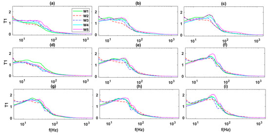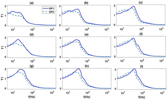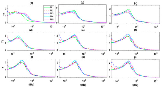 The vibration transmissibility at the wrist part on different wrist posture (SP1). (a) g0 N, p20 N, (b) g0 N, p50 N, (c) g0 N, p80 N, (d) g30 N, p20 N, (e) g30 N, p50 N, (f) g30 N, p80 N, (g) g60 N, p20 N, (h) g60 N, p50 N, (i) g60 N, p80 N.