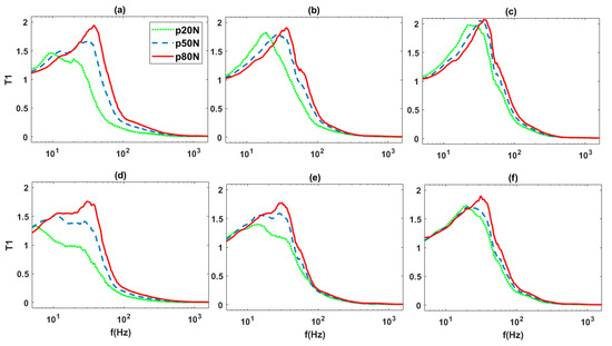 Effect of grip force on the total averaged vibration transmissibility. (a) SP1, p20 N, (b) SP1, p50 N, (c) SP1, p80 N, (d) SP2, p20 N, (e) SP2, p50 N, (f) SP2, p80 N.