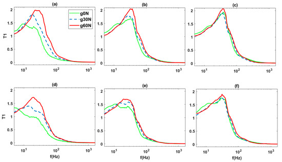Effect of the thrust forces on averaged total vibration transmissibility. (a) SP1, g0 N, (b) SP1, g30 N, (c) SP1, g60 N, (d) SP2, g0 N, (e) SP2, g30 N, (f) SP2, g60 N.