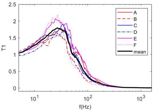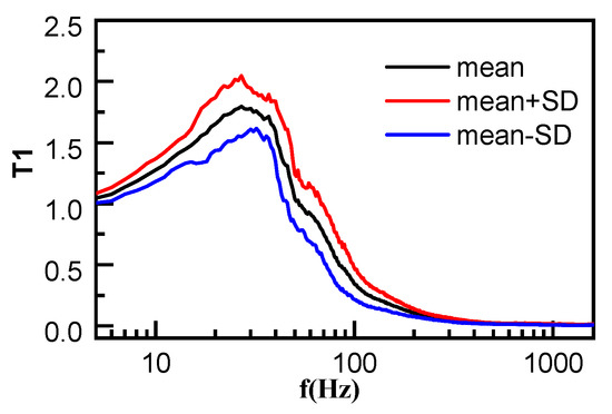 Figure 15 shows the total vibration transmissibility of the six subjects and their mean values, and Figure 16 shows the mean and standard deviation of the total vibration transmissibility of the six subjects. These results were obtained under grip force 30 N and thrust force 50 N with the W1 and SP1 posture. From Figure 15 and Figure 16, it can be seen that the trends of the total vibration transmissibility of the six subjects were similar, but there were significant differences between these individuals around the peak transmissibility. The largest deviation of the transmissibility is 0.316, which occurred at the frequency of 47 Hz, and the mean value of the vibration transmissibility at this frequency is 1.23. This deviation and the mean value of the transmissibility are very comparable to the literature [16], but there is a difference of 14.2 Hz in the corresponding frequency. In addition, it can be seen from Figure 15 that each transmissibility curve has a distinct peak, with resonance frequencies between 25 and 37 Hz for the six subjects and a mean frequency of 27 Hz, all of these frequencies being within 16–50 Hz [13]. The large differences in individual vibration transmissibility may be related to their kinetic properties and anthropometric data, as well as changes in grip force, thrust force, and arm posture during the experiment [16]. Therefore, the experiment conditions should be strictly controlled and the influence on the test data should be reduced during the experiment.