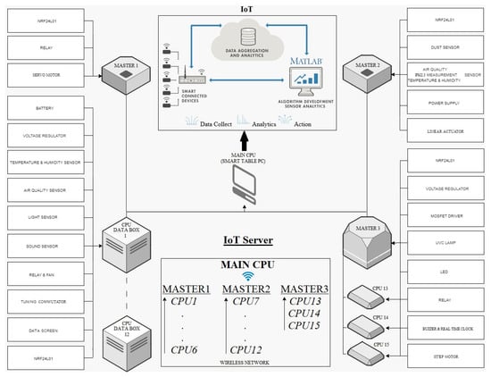 There is a data box designed to make measurements at all positions numbered from 1 to 12 in Figure 2. On this box, there is a display where students can see the collected data and a tuning commutator to enter the personal temperature value. The collected data are transmitted wirelessly to the processor called MASTER1 (Figure 1). The average classroom temperature is calculated using the values received from a total of 12 positions. However, if a student requests a value different from the average value, the personal air conditioning fan on the student’s desk is activated. This hardware has a central processor card. With this card, the data of other sensors can also be used in the classroom automation system and transferred to the IoT system. In each box, there is a sound sensor, light sensor, temperature and humidity sensor, air quality sensor, wireless communication card, double relay card, battery slot, regulator card, and processor. Figure 5 shows the basic algorithm of this system’s software.