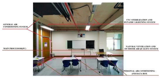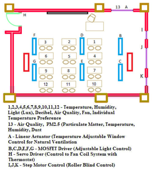 Figure 2 shows the seating plan of students with numbers 1–12. From these 12 different positions, six types of data are obtained: temperature, humidity, light, sound intensity, air quality, and individual temperature preference. Five types of data, namely outdoor air quality, PM2.5 value, dust amount, temperature, and humidity, are received from the section where natural ventilation is controlled, which is expressed with number 13 and letter A in Figure 2. Each of these data is processed with different processors, and the natural ventilation system, dynamic air conditioning system, dynamic lighting system, personal air conditioning system, UVC sterilization system, and roller blind positioning system are controlled automatically.