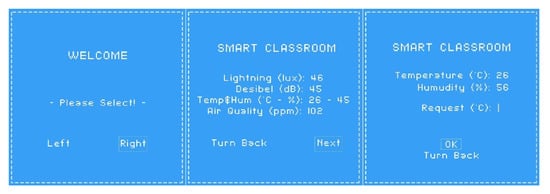 The structure of the SCI system is very complex since it contains a lot of data and a sensor network. However, it has a simple interface so that students cannot be distracted and prevented from focusing on the lesson and do not waste time with it. Therefore, each student can only see the data on their desk using this interface and enter the temperature demand for personal air conditioning. The images of the interface are presented in Figure 6.