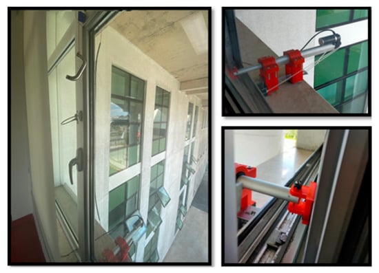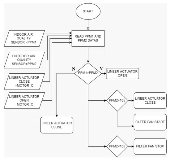 The system enables natural ventilation when necessary. For this purpose, there is a temperature, humidity, PM2.5 particulate matter ratio and air quality sensor, dust sensor, wireless communication card, motor driver card, regulator, battery, and processor in position 13 (in Figure 2). There is also a linear actuator to open or close the window in position A. If the air quality is lower than the determined level according to the data received from the data boxes in the classroom, the temperature, humidity, PM2.5 particulate matter ratio in front of the window, and the data received from the sensors that measure the air quality are compared. Thus, the linear actuator is activated, and the window opens. The window is kept open for the required time to enable natural ventilation (Figure 7). If the measured outdoor air temperature differs from the temperature measured indoors, the dynamic air conditioning system in the classroom is activated. Figure 8 shows the basic algorithm of this system’s software.