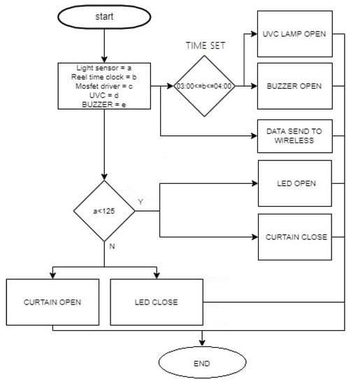 Dynamic lighting and UVC sterilization system have been used in the SCI. For lighting, LED lighting panel was placed in each of the B, C, D, E, F, G positions (Figure 2). The panels placed with both sides were driven in parallel. In Figure 2, there are roller blinds in positions I, J, and K. The dynamic lighting system also controls them. Accordingly, it prevents students from exposure to direct sunlight and ensures making use of natural lighting as much as possible. A wireless communication card, buzzer, MOSFET driver, real-time clock module, processor, and UVC lamp were placed between these panels. Three step motors were used to control the roller blinds individually. Light sensor data and a real-time clock module are used to control the roller blinds. In line with the light sensor data received from positions 1, 4, 7, 10, 2, 5, 8, 11 and 3, 6, 9, 12 in Figure 2, LED panels in positions B, C, D, E and F, G are driven. Moreover, the environment is sterilized between 03:00 and 04:00 at night when the school is closed. To this end, a UVC lamp and buzzer system (for warning) are used. The basic algorithm of the system’s software is given in Figure 9.