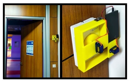 Dynamic air conditioning system has been used in the SCI. For this purpose, in Figure 2, there is a fan coil control panel in position H and a fan coil air conditioning system in each of two positions represented by red rectangles. As a standard, the fan coil system has three different fan blowing levels and thermostatic control. The thermostatic part was normally controlled manually by a potentiometer. For the automatic control of this unit, a servo motor was connected to the shaft of the potentiometer. To adjust the fan speed, another servo motor was used. These servo motors were driven using the average values of the temperature data received from positions 1–12 in the classroom. A relay driver was used for on-off operation. A processor and a wireless communication card were used for these operations. The system is shown in Figure 10.