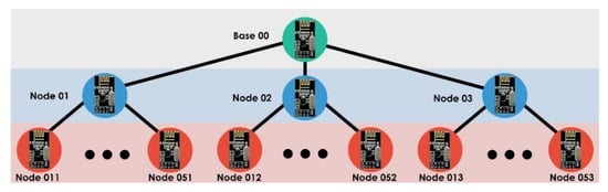 Based on the tree topology method in Figure 11, there is a master NRF24L01, three NRF24l01 nodes, and five slave NRF24L01s under each of these nodes in the system. Microcontrollers with each slave transmitter transfer the data they read at 20 s intervals to a higher node to which they are connected. All nodes transfer the data to the controller where the master NRF24l01 is located. All data collected on the master controller are sent to the main processor and transmitted to the IoT system. A structure consisting of variables, as seen in Figure 11, is designed, and the data read from the controllers are sent to the next receiver as a data package. In this structure, the variable named “nodenumber” was used so that the master controller could analyze which transmitter the sent data came from. This variable must be a unique number for all transmitter controllers with NRF24101.