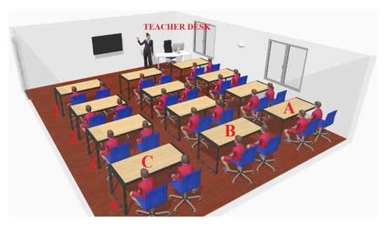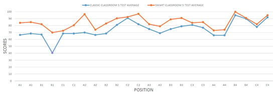 In Turkey, students are subjected to the secondary education transition exam at the end of the 8-year compulsory primary education system. This exam includes 20 mathematics, 20 science, 20 Turkish, 10 history, 10 religious culture and moral knowledge, and 10 English questions. Students are placed in the schools they have written in the preference list according to the scores they have received in this exam. Students’ classes are also determined according to these placements. Thus, identical distribution is ensured. In the study, 24 students were included in the experimental group and 24 students in the control group. First, the experimental and control groups attended 30-h lessons, which were presented by the same teachers in five different branches, namely Mathematics, Physics, Chemistry, Biology, and Turkish, every week for five weeks. They were then subjected to examination. It was observed that the average score of students in the classroom where the automation system defined as SCI was installed was 85, and the average score of students studying in the classical classroom was 74. The coding showing students’ positions in the classroom for score comparison is presented in Figure 13.