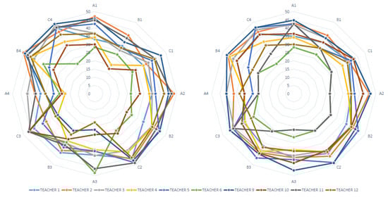 During the lessons, the sound distribution of 10 teachers was measured at 12 points where the students’ desks were located. Accordingly, sound distribution maps were obtained. If the sound level was inadequate in any part of the classroom or if there was an indoor or outdoor noise that prevented hearing, the teacher was warned visually with a sound distribution map at the end of the lesson. The data distribution chart of the teachers who were provided with feedback, obtained after 3 weeks, is presented in Figure 14. It was observed that the relevant course success of the teachers who taught in the SCI became similar to each other independently of the positions, and the teachers ensured a more homogeneous sound distribution.