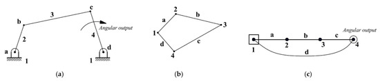 In a four-bar linkage, one angular output is obtained by link-4 as shown in Figure 1a. A modified graph theory is developed to represent a four-bar mechanism according to the following steps: