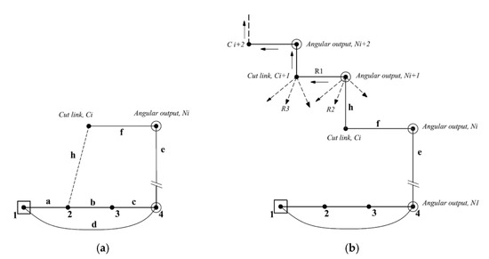 - One of the linkage configurations, with a specific number of angular outputs, is selected as illustrated in Figure 3a. The selected configuration has a latest RRR dyad that contains angular output ‘Ni’, link ‘Ci’, which is denoted as ‘cut link’, and revolute joints namely: e, f, and h.