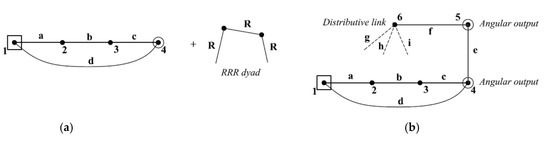 Three angular outputs can be generated from six-bar linkages that have two angular outputs as represented in Figure 6a. The existing RRR dyad contains: angular output ‘5’, cut link ‘6’ and three revolute joints namely: i, j and k. A new angular output can be achieved by adding another RRR dyad using series connection as illustrated in the following steps: