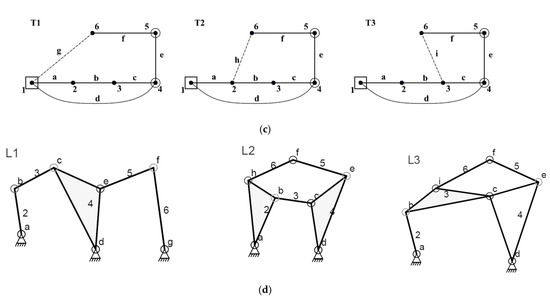 Linkage diagrams can be sketched for all generated topologies. For example, linkage diagram ‘L1’, shown in Figure 4d, can be sketched from its corresponding topology ‘T1’, shown in Figure 4c, according to the following algorithm:
