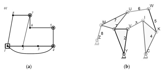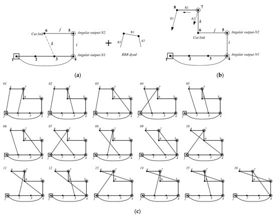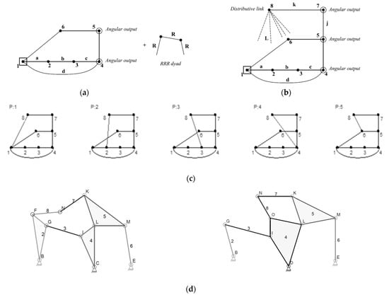 - The last revolute joint, l, has five alternatives to connect distributive link-8 with other links in the original linkage graph, excluding the connections that produce rigid sub-chains. These alternatives generate five available eight-bar topological graphs that can achieve three angular output motions as shown in Figure 5c.