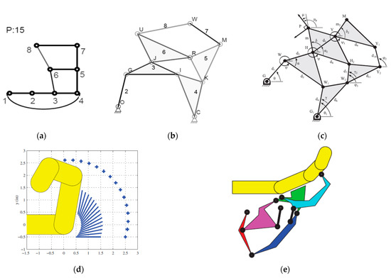 Using eight-bar linkage as exoskeleton for finger rehabilitation. (a) Selected graph from presented database; (b) corresponding linkage diagram; (c) equivalent exoskeleton linkage introduced by [21]; (d) desired motion for finger introduced by [21]; (e) resulting eight-bar linkage introduced by [21].