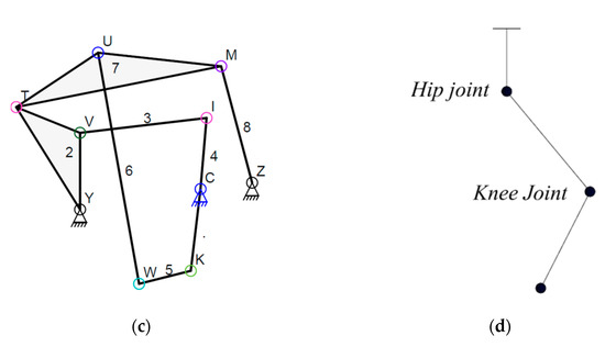 Using eight-bar linkage as exoskeleton for leg rehabilitation. (a) Selected graph from presented database; (b) corresponding linkage diagram; (c) equivalent exoskeleton linkage; (d) Lower limb joints.