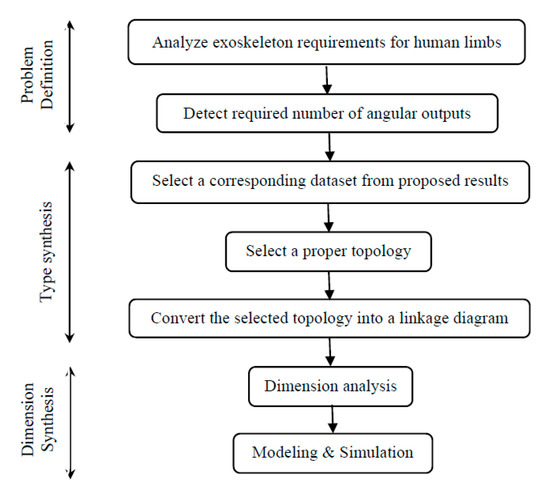 However, exoskeleton design procedures can be summarized in the flow chart shown in Figure 9. The main concern of the present study is the type synthesis procedure. The flow chart illustrates how the proposed results can be used during the design process.