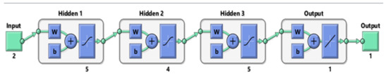 Figure 3 shows a diagram of the neural network created by the authors. It consists of two inputs, pressure in the system and control time, and one output for the injection dose.