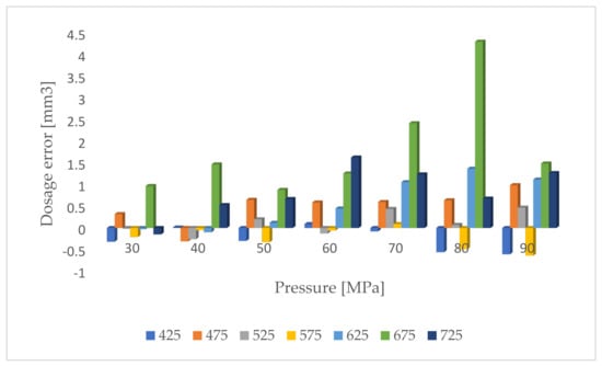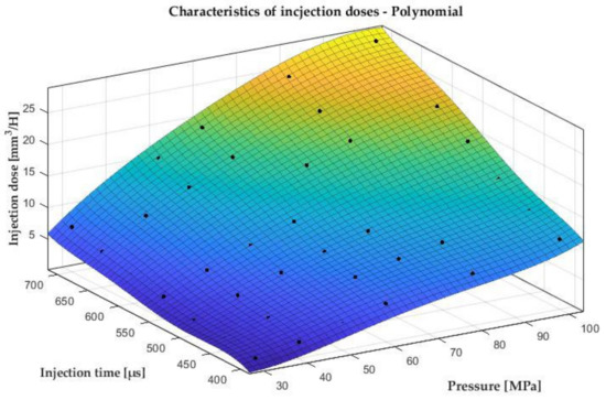Then, based on the standard operating characteristics (Figure 6) of the tested injector, using polynomials in the Matlab environment, the injection doses were modelled, Figure 8.