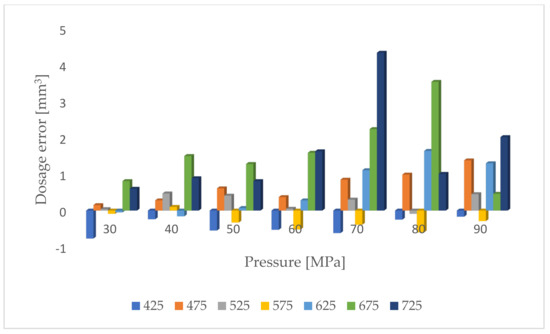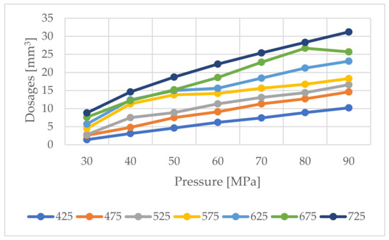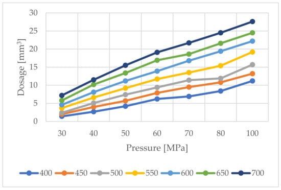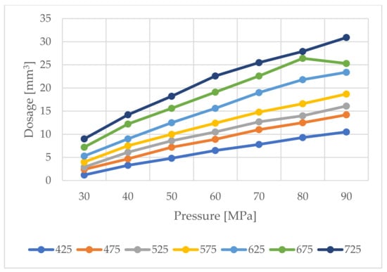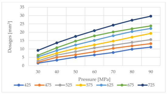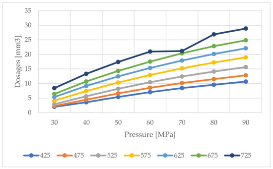 Based on the standard operating characteristics (Figure 6) of the tested injector, using polynomials in the Matlab environment, the injection doses were modelled, Figure 11.