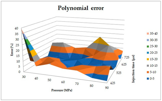 In the case of the conducted analysis, the most favorable results were achieved with a polynomial with a variable x of the fourth degree and y of the fifth degree. On the basis of statistical values such as SSE, R-square, adjusted R-square, RMSE, the accuracy of the developed polynomials to the measurement results was assessed. Thanks to this, we were able to assess which equation most faithfully reproduces the injector’s behavior. Table 1 presents the statistical values.