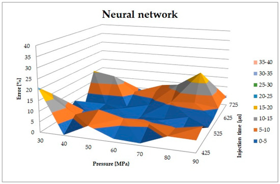 When analyzing the above characteristics and the results presented in Figure 14 and it can be noticed that the largest dose error occurs near the greatest workload of the injector and the maximum difference is at the level of 4.3016, i.e., approx. 16.28%. When checking other network structures, the biggest errors were also found around the highest load.