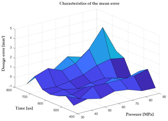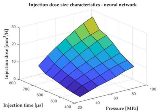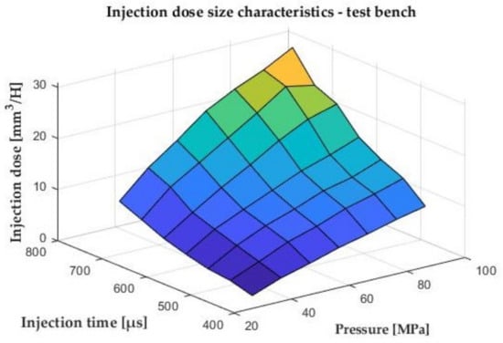 Characteristics of injection doses depending on pressure and injection time. X axis—pressure [MPa], Y axis—injection time [µs], Z axis—injection dose [mm3/H].