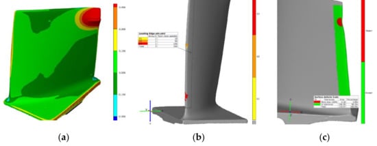 The 3D scanner successfully detected any deviations from the gold standard, i.e., 100% defect detection. The full blade scan and processing of the scan data took just under a minute (approx. 55 s). Repeated scanning resulted in the same inspection outcome, i.e., blades rejected in the first round of inspection were also rejected in the second round. The same applied for accepted blades. Thus, the scan repeatability was 100%. While it is known that any measurement systems including 3D scanning have a measurement error, this did not affect the inspection results of this study.