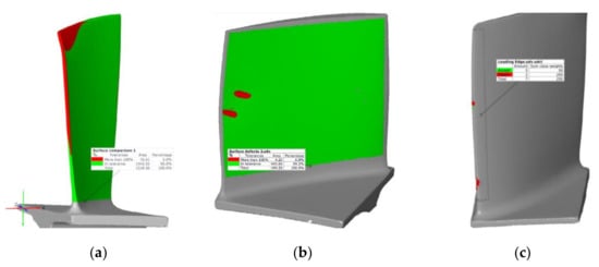 The results can be visualised in different ways using colour coding to highlight the deviation based on (a) metric measurements, (b) severity levels and (c) as accept/reject criteria. An example of each representation is given in Figure 4. For the purpose of this study, the accept/reject representation was chosen, since it allows comparison of the results with the IP and AI software. In the scan output, any deviations between the scanned and nominal blade are coloured in red. This corresponds to the bounding boxes in the borescope and piece-part inspection software.