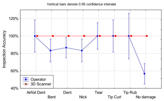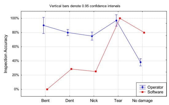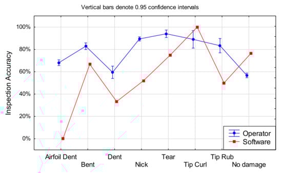 Figure 6 shows the mean plot of the inspection accuracies achieved by each inspection agent for each type of defect. The operator consistently outperformed the software on all defects except tip curl and non-defective blades. The biggest difference in detection accuracy occurred for airfoil dents. This was because the software was programmed to detect edge damage, not airfoil defects. Furthermore, it was noticed that the software performance was proportional to the amount of deformation of the blade, i.e., smaller defects such as nicks, dents and minor tip rub were more difficult to detect than more advanced and salient detects including bends, tears and tip curls (airfoil dents < dents < tip rub < nicks < bends < tears < tip curl). The human operator had a similar but not identical order of successful defect detection (dents < airfoil dents < bends < tip rub < tip curl < nicks < tears). This order represents the criticality of the different defect types rather than solely their appearance, although the two were somewhat correlated. There is a chance that the operators consciously or unconsciously applied their underlying mental model [9], which might have influenced their decision making, i.e., they know what defect types are more critical than others. The software does not have that contextual knowledge and relies solely on the visual appearance of the defect.
