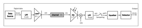 where is a single symbol transmitted at time ; is the symbol period; represents the impulse response of the transmitter, which includes both the modulator driver and the modulator impulse responses; and represents the modulator electrical current input to optical field output transfer function. The modulator output is followed by a single mode fiber (SMF) with impulse response ; thus, the receiver optical input field is presented by Equation (2), where * denotes convolution.