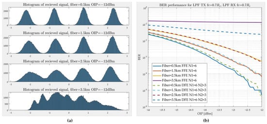 (a) histograms of the received signal, before the equalizer with different fiber length = 0.5, 2.5, 3.5 km. = 0.75 Rs Hz, OIP = −10 dBm. (b) BER curve for three different fiber length = 0.5, 1.5, 2.5, 3.5 km, and two equalizers FFE with , DFE with , . RX , TX .