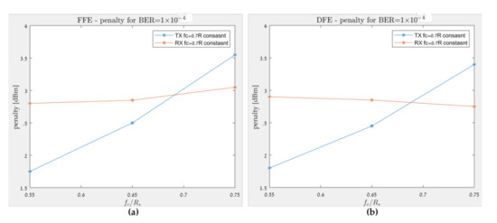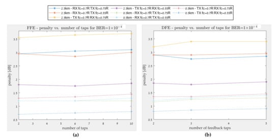 The first step of the research was to find the ideal numbers of taps. During the research, we tried to investigate its impact on the equalizer’s performances. We did not find any great improvement with the increase in the number of taps. In fact, we witnessed a degradation in some of the cases. Figure 4a shows some of the results for the FFE. Clearly, the penalty is higher as the fiber is longer. The independency of the penalty on the filter BW () will be discussed in Section 4.2 and Section 4.3.