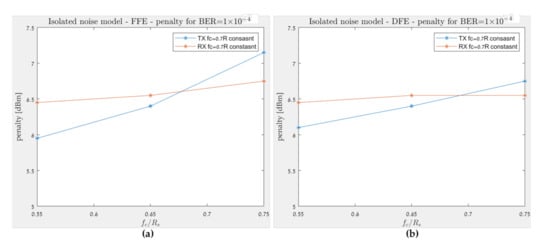 To confirm the explanation in the previous subsection about the effect of the noise, we performed another test and moved the noise source to the filter’s output and isolated it. As shown in Figure 6, we still obtained better results with the narrow RX filter; however, its advantage decreased and the penalty for using a wider filter dropped to 0.65 dB and 1.2 dB to DFE and FFE, respectively (compared to 1.6 dB and 1.8 dB).