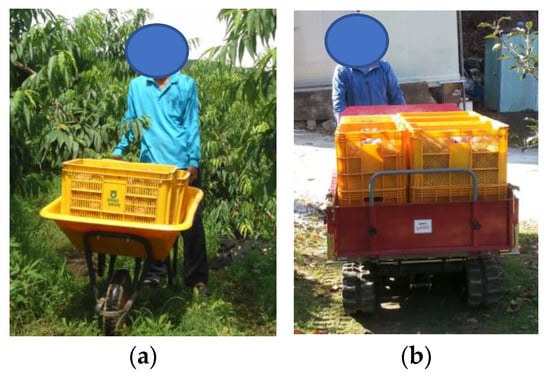A powered cart equipped with tracked wheels was introduced to reduce the postural load to an acceptable level (Figure 1b). The powered cart engine uses gasoline as fuel; thus, it is not environmentally friendly because of the exhaust gas and noise, and the exhaust can also affect the health of the operators and others in the vicinity. However, it is more suitable for use on sloped areas because of its high engine power. The cart costs about USD 3380 (KRW 40,000,000). Three members of the organization purchased the powered cart with tracked wheels without height adjustability. These carts have advantages in that their center of gravity remains constant during motion, thereby reducing the amount of force required to operate the cart. This in turn allows the transportation of more bags of compost or boxes of harvested peaches (maximum load allowance = 500 kg). Thus, 25 bags of compost or 10–12 boxes of peaches at the maximum can be transported based on the size of the cargo box in one trip, which improves the transport efficiency by 5–8 times. Further, when this cart is introduced for transporting compost or harvested peaches, the postural load is reduced to RULA action level 1, which is acceptable for most workers when not maintained or repeated for long periods [].