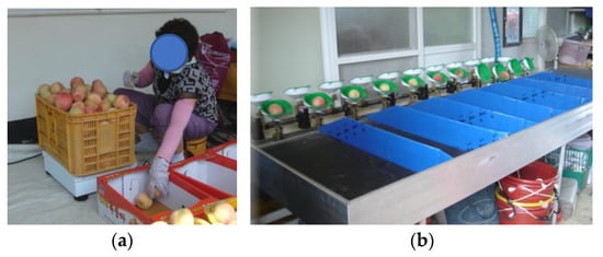 Sorting harvested peaches: (a) manual sorting; (b) automatic sorting.