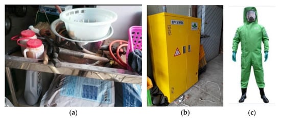 Several pesticides are used in peach farming from March to August. New pesticides or pesticides left after use are scattered haphazardly in farmhouses or peach farms, and they are not stored appropriately. Therefore, there may be a risk of inhalation by humans, who may mistake these substances for beverages or come into contact with the pesticide (Figure 4a). A dedicated box with a lock was therefore provided to safely store the pesticide in a designated place (Figure 4b). Protective clothing was also adopted to prevent pesticide poisoning during spraying (Figure 4c).