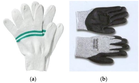 Different types of work gloves: (a) woven glove; (b) cut-resistant winter glove.
