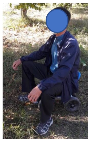 In Korea, a considerable amount of agricultural work is performed in seated positions on the ground or low stools with the knee and lower back severely flexed as in sorting, especially in field farming (Figure 3a). To avoid these awkward postures in field farming, height-adjustable agricultural stools with wheels were recommended. The stool helps reduce postural stress acting on the knee and lower back, as shown in Figure 7. Further, the stool makes it easy for farmers to move and work at different locations. The posture shown in Figure 7 was assessed as RULA action level 2.