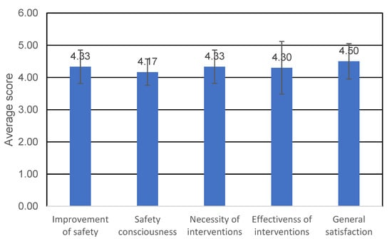 Four weeks after implementing the ergonomic interventions, a questionnaire survey was administered to all members of the organization on a five-point Likert scale to investigate the satisfaction and effectiveness of the interventions. The results of the survey are shown in Figure 8; the average scores for all five items adopted in the questionnaire survey were >4.1, indicating that all members agreed with the benefits, necessity, and effectiveness of the interventions, in addition to being satisfied with the proposed measures.