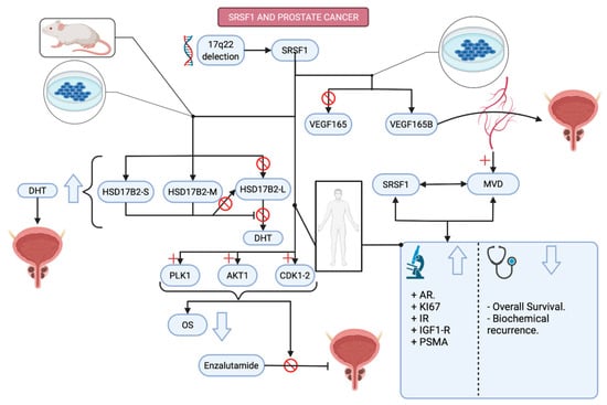 Regarding histological features, SRSF1 was related to overall MVD and with positive Ki67, the expression of Androgen Receptor (AR), Insulin Receptors (IR), insulin-like growth factor 1-receptor (IGF1-R), and the expression of prostate specific membrane antigen (PSMA); MVD was related to the expression of SRSF1 and also with positive Ki67, expression of Insulin Receptors (IR), (insulin-like growth factor 1-receptor) IGF1-R, and the expression of prostate specific membrane antigen (PSMA). In the sub-cohort of patients affected with PCa, SRSF1 was also related to the expression of AR, Ki67, IR and MVD [22]. In conclusion, several studies found a clinical and biological role of SRSF1 in PCa genesis, progression, and recurrence.