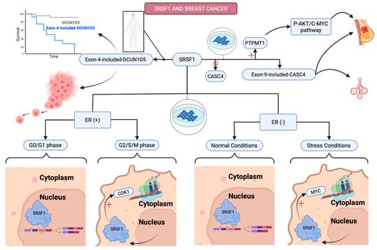 Another molecular study published in 2020 revealed that SRSF1 is not only an alternative splicing factor, but also has a crucial impact on IRES-mediated translation during the initiation of the mRNA in particular. In ER (-) breast cancer cells its role depends on growth conditions: under usual conditions, SRSF1 is located within the nucleus and it is involved in alternative splicing mechanisms and in the encoding of elements that also regulate the translation; however, under stress conditions, SRSF1 translocases from the nucleus to the cytoplasm where it plays a key role as an ITAF (Internal Ribosome Entry Site) and where it promotes MYC, and other mRNA, translation. On the other hand, on ER (+) breast cancer cells, SRSF1 plays a role depending on the cell cycle: during the G0 and G1 phases it modulates translation with alternative splicing mechanisms, during mitosis nucleus disassembling promotes the cytoplasmatic translocation of SRSF1 where it covers the role of an “ITAF”, similar to that in ER (-) cells regulating the mitotic landscape [27].